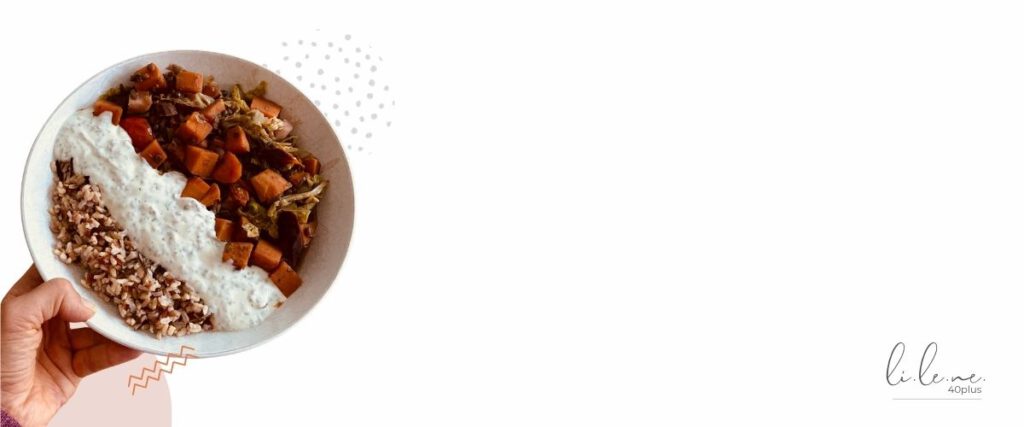 Die wunderbar wärmende, herbstliche Hormon-Balance-Bowl enthält nur Lebensmittel, die hervorragend in eine antientzündliche, hormonfreundliche Ernährung für Frauen in den Wechseljahren passen.